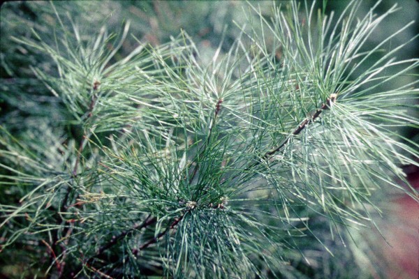 Leaves (needles) are soft, flexible and bluish-green to silver green in color and are regularly arranged in bundles of five. Needles are 2 1/2-5 inches long and are usually shed at the end of the second growing season. Both male and female flowers (strobili) occur on the same tree, with pollination occurring in spring. Cones are 4-8 inches in length, usually slightly curved and mature at the end of the second season. Cone scales are rather thin and never have prickles. Cones also have exudations of a fragrant gummy resin.